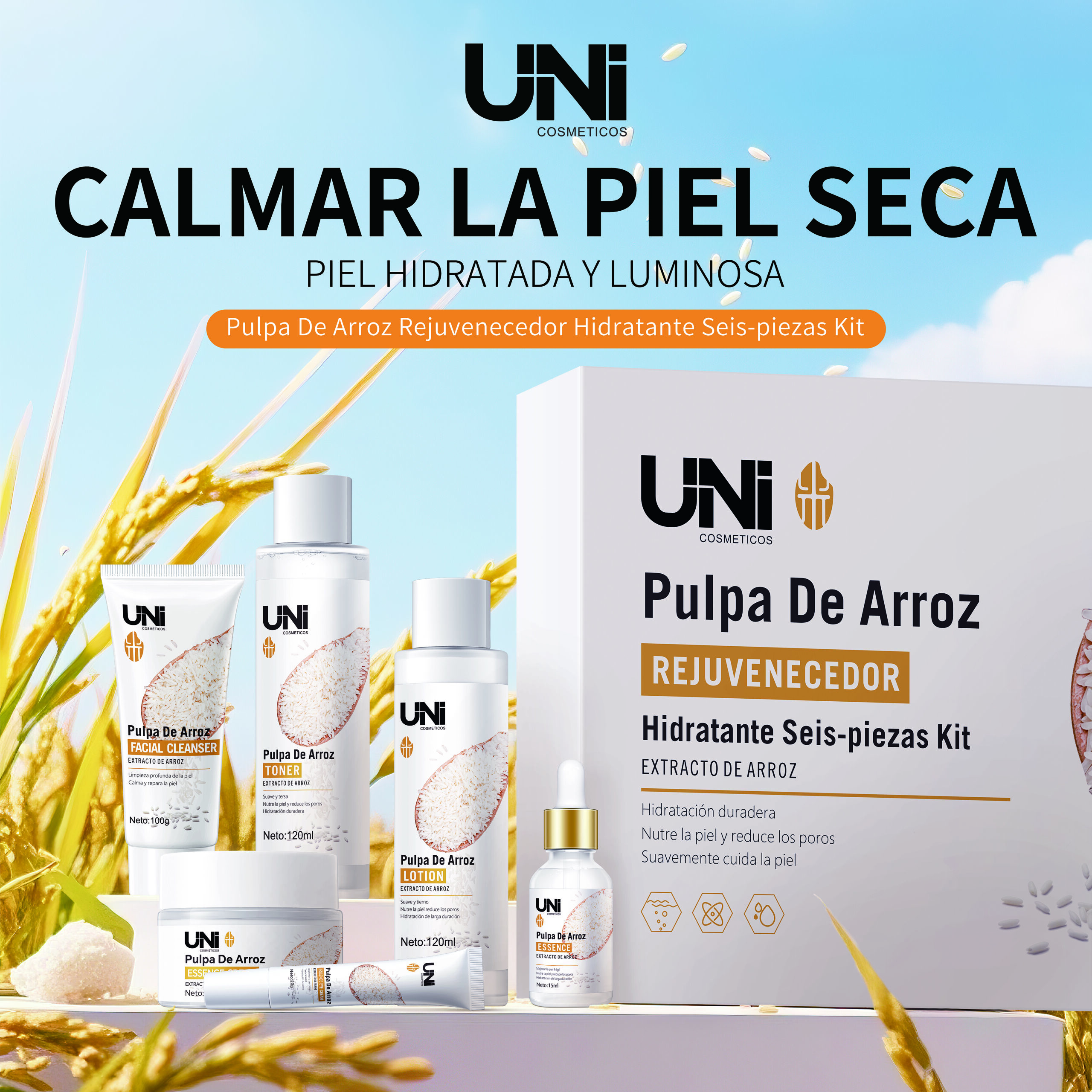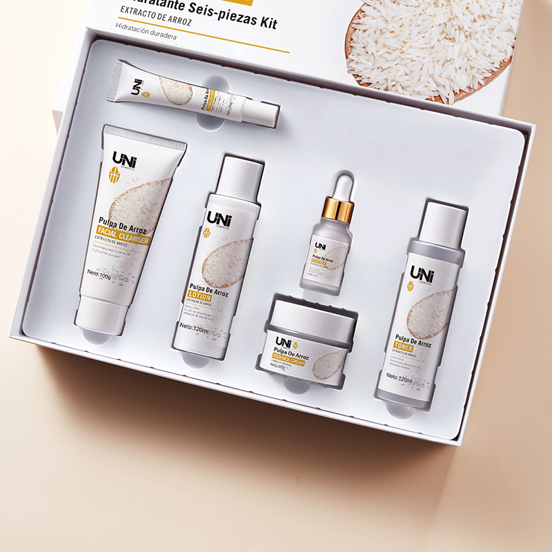 Este producto es un set de cuidado de la piel que incluye 6 piezas diseñadas para una rutina de limpieza e hidratación .