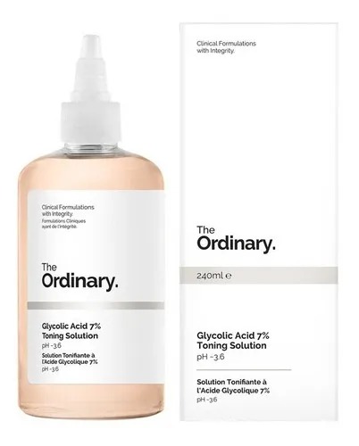 The Ordinary Glycolic Acid 7% Exfoliating Toner – 240ml es un tónico nocturno a base de agua con ácido glicólico y extractos botánicos. Es un tratamiento que exfolia suavemente la piel para devolverle una apariencia clara y radiante. Con el uso regular mejora el aspecto del tono y la textura desiguales.