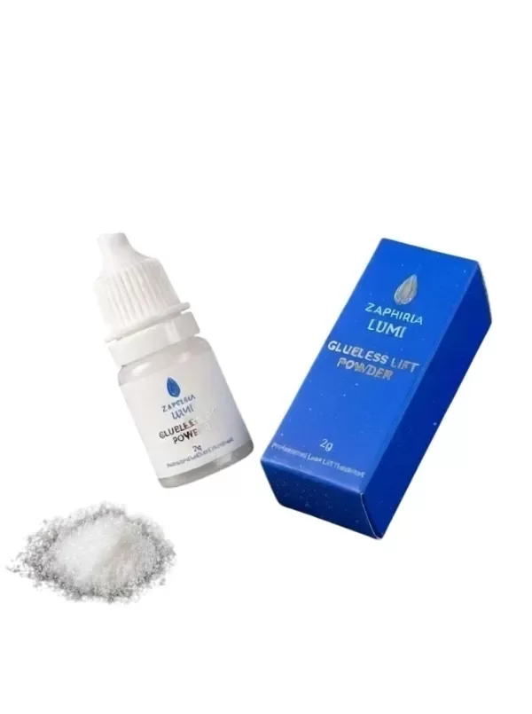 - Zaphiria Lumi Glueless Lift Powder: Adhesivo en polvo para lifting que se utiliza para espesar y aumentar la viscosidad del bálsamo, lo que facilita el trabajo en los moldes y mejora la adherencia sin dejar residuos.